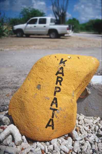 Sign at the "Karpata" dive site with our pickup truck in the background