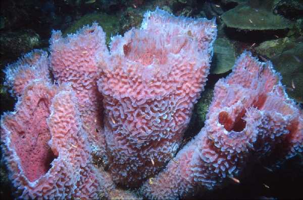 Blue and reddish glowing hard tube corals