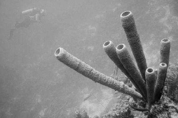 A small diver and big tube-sponge corals. Color removed to make it look more interresting